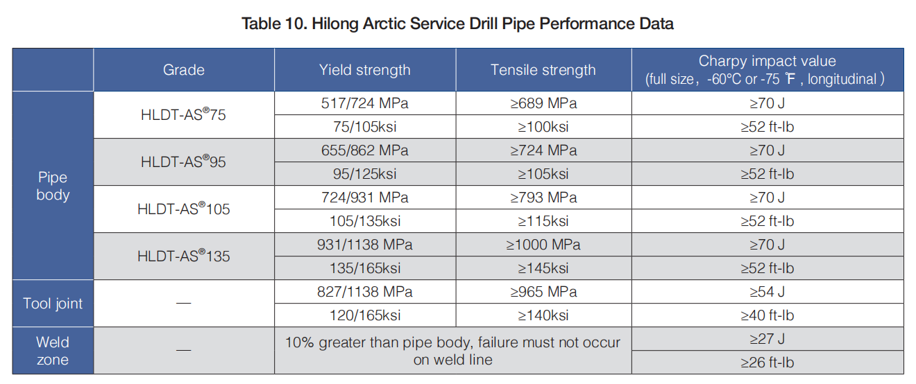 Compared to conventional API drill pipe, Hilong's proprietary Arctic Service Drill Pipe has a higher low temperature impact value and a lower brittleness transition temperature, resulting in better resistance to brittle fracture. Apparently, these arctic service products have better Fracture and fatigue resistance than normal API series if both of them are all used in room temperature, thus the service life could be improved evidently.