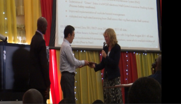 海隆油服尼日利亞項目組建伊始,就嚴格執行總部和甲方制定的各項HSE政策和規章制度、并結合自身實際制定系列HSSE管理措施,在人員安全、環境保護等方面都取得了良好的成績。尼日利亞項目現有HL-2、HL-19兩部2000HP鉆機,自開鉆以來,LTI為零,全年無任何人員傷亡事件。鑒于以上HSSE工作的優秀表現,海隆油服尼日利亞項目公司受邀參加此次HSSE論壇會,項目總經理陳聚慶在會上做了HSSE工作介紹,并接受了頒發的獎牌。海隆也是在SPDC五十多個承包商中,少數幾家在會上發言并獲獎牌的承包商之一。